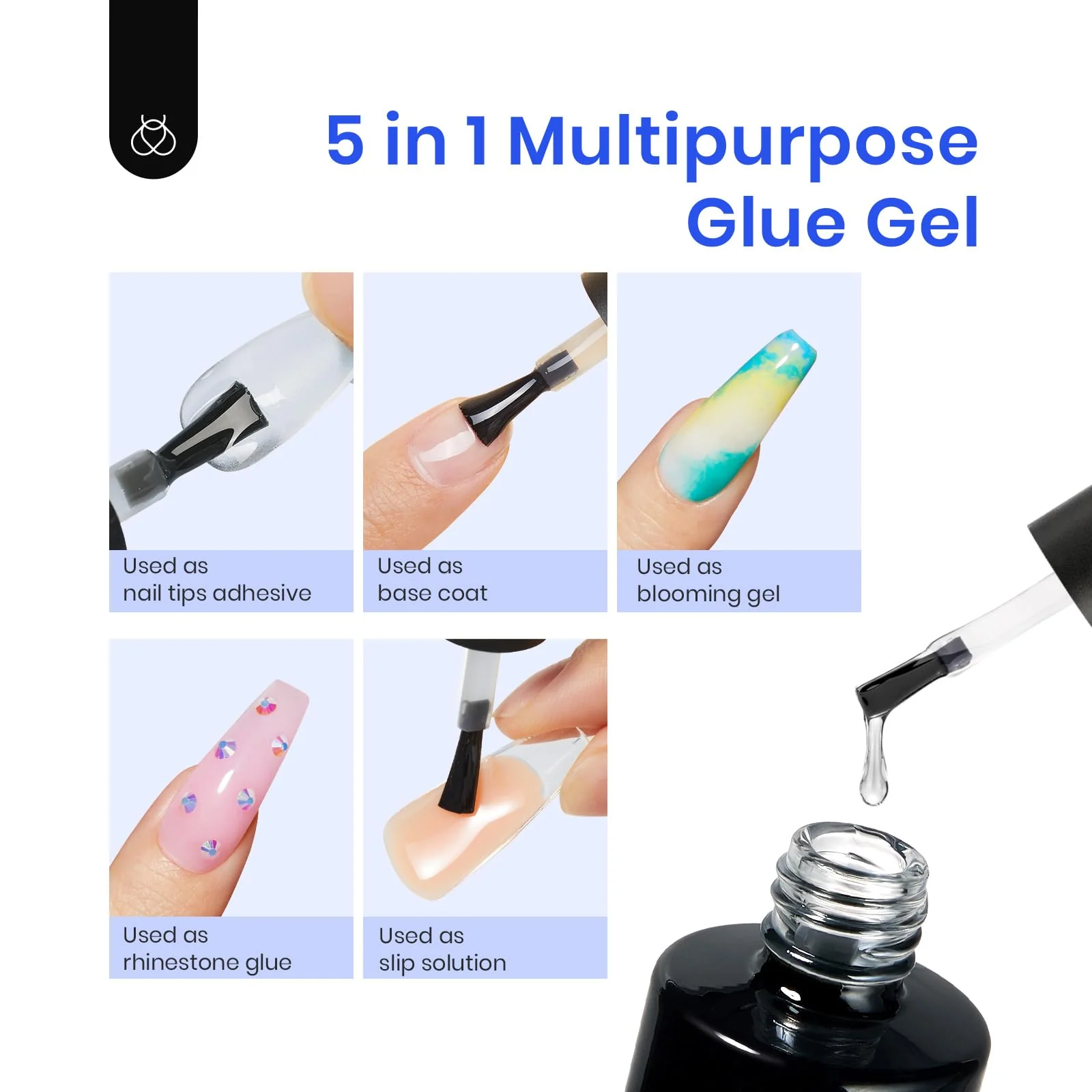 - 5 In 1 Multipurpose Glue Gel:This multi-functional nail gel is not only for nail tips adhesive, but also can be used as base gel! Moreover, it can be used as blooming gel, rhinestone and slip solution.